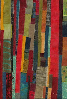 I’m sewing a fabric installation that we created in our January interim “Worship and the Arts” Sunday School class. What great energy and creativity I experienced as we dialogued about wisdom and faith! This small piece was the inspiration for a piece of our larger installation …. a color play I did over Christmas break in lovely warm Christmas colors that we translated into slightly brighter colors to evoke the variety of seasons of our life here on this earth.