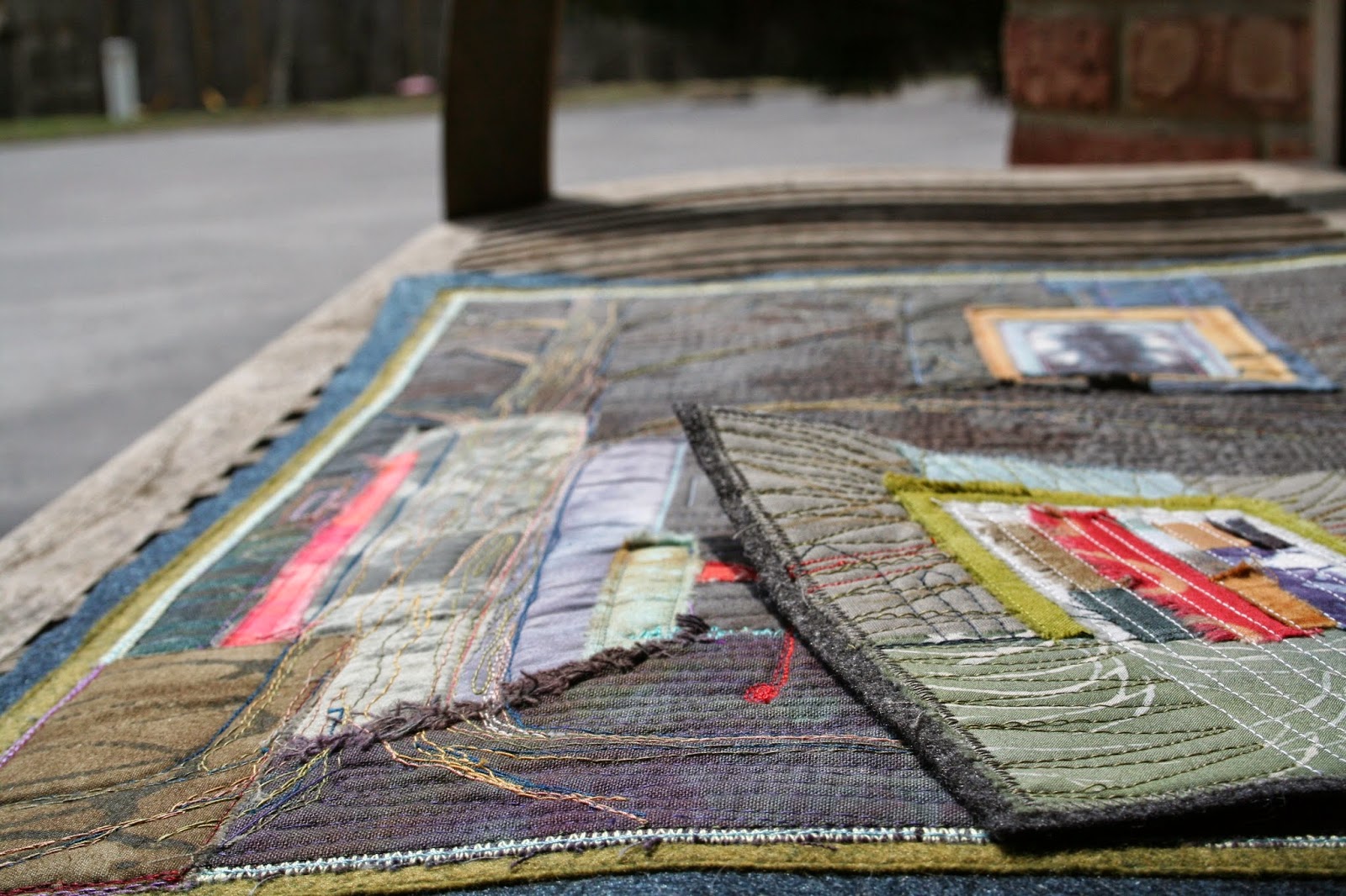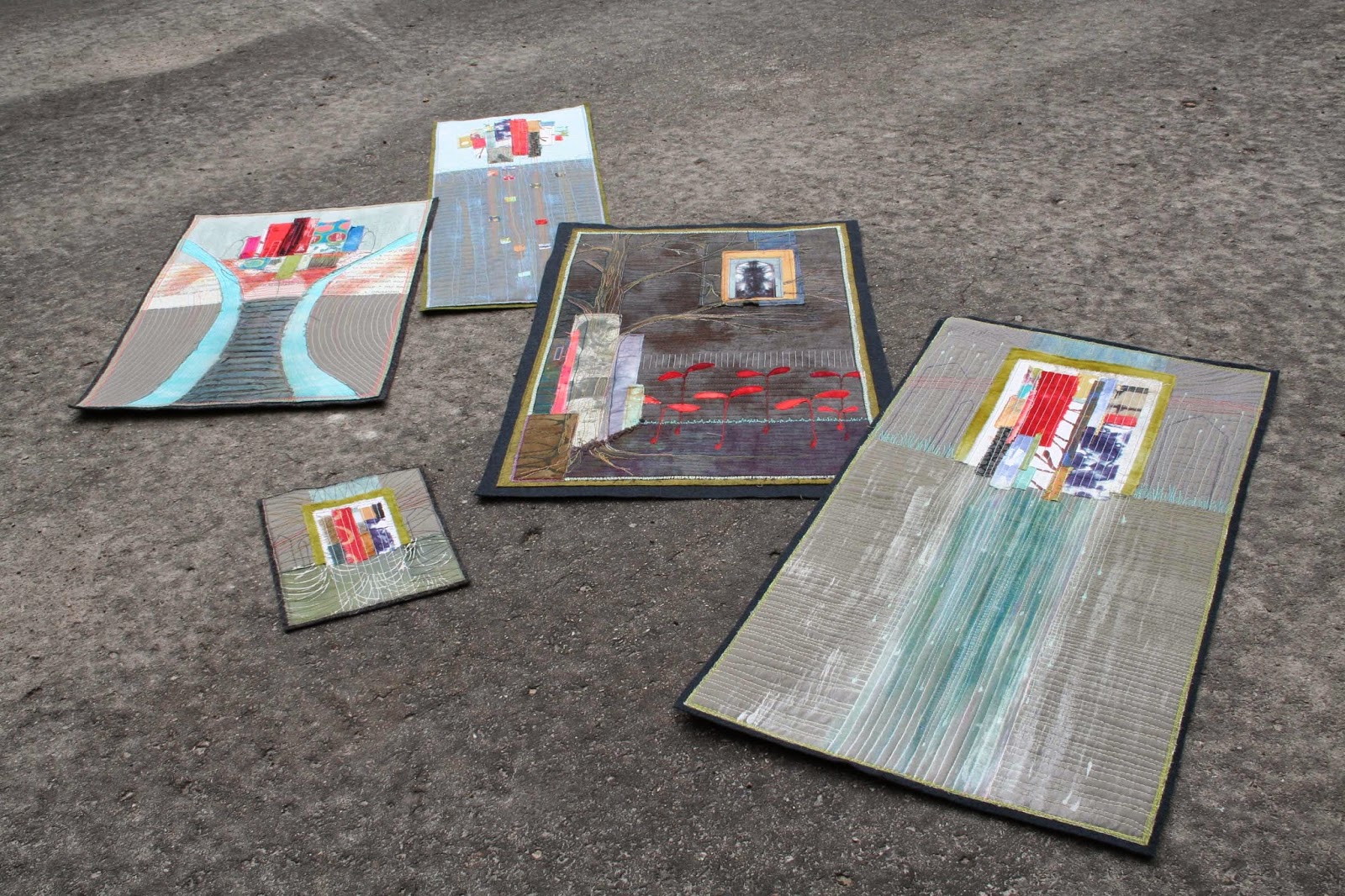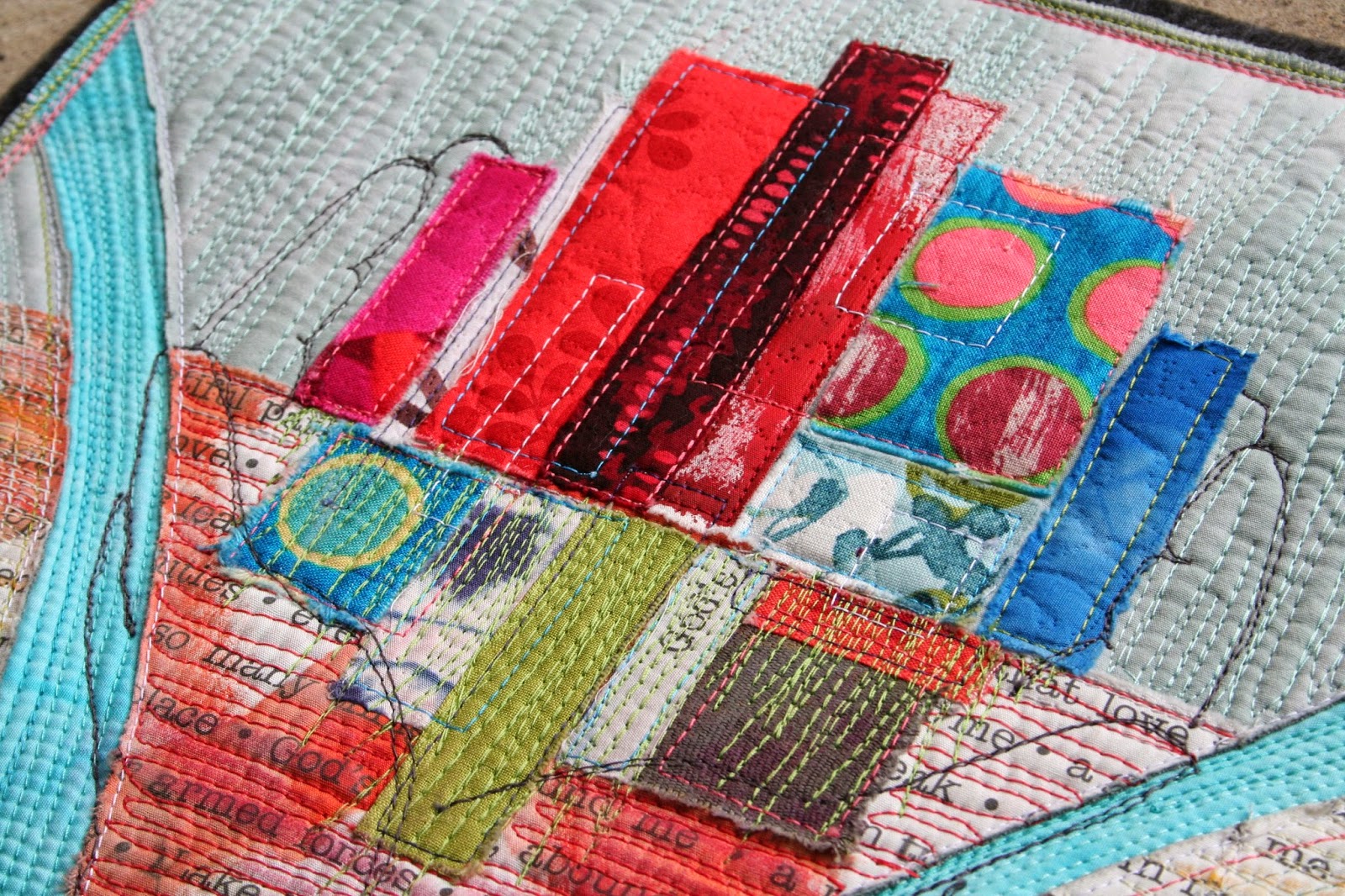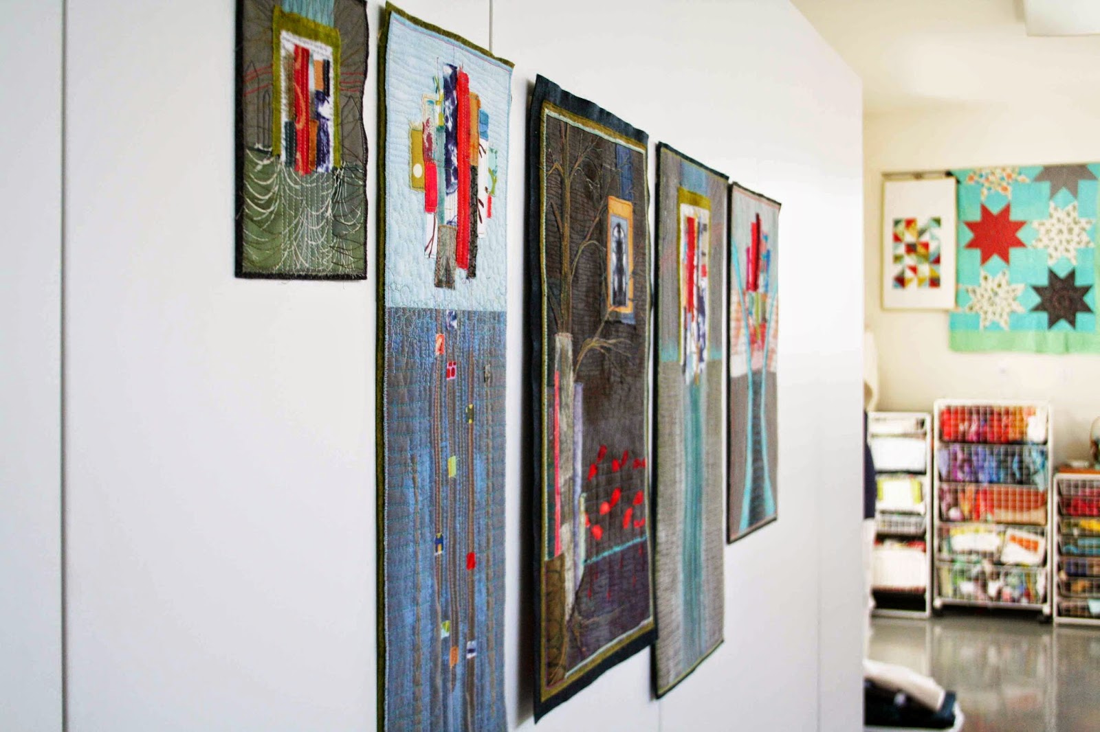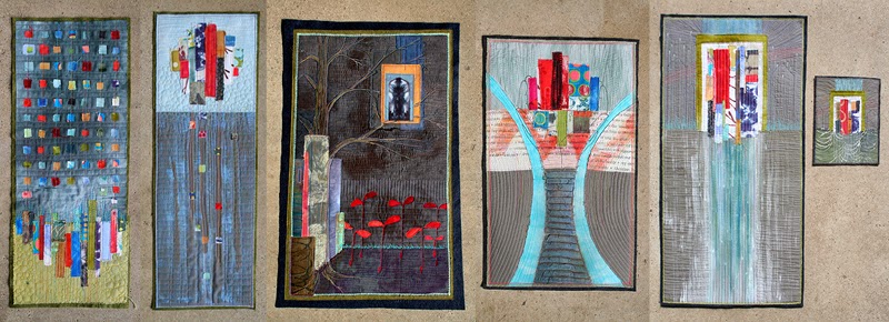 So, what did it take to just “finish” them? The second from the left was on a green background – ripped it off the background, picked a happy light blue, changed the size of the background, then needed to make the circle of wisdom smaller, added some squares just because I could! The fourth from the left still has composition flaws – added watercolor pastel, then some white gesso, bright coral thread for the border. Lesson learned – if the composition isn’t quite right, fix it before you start sewing! The fifth one from the left, over a year later after literally living on the design wall – added watercolor pastel, narrowed the canvas, added more watercolor pastel, added white paint, and more white paint, and I finally stopped. And to think this all started with the sample door on the right.