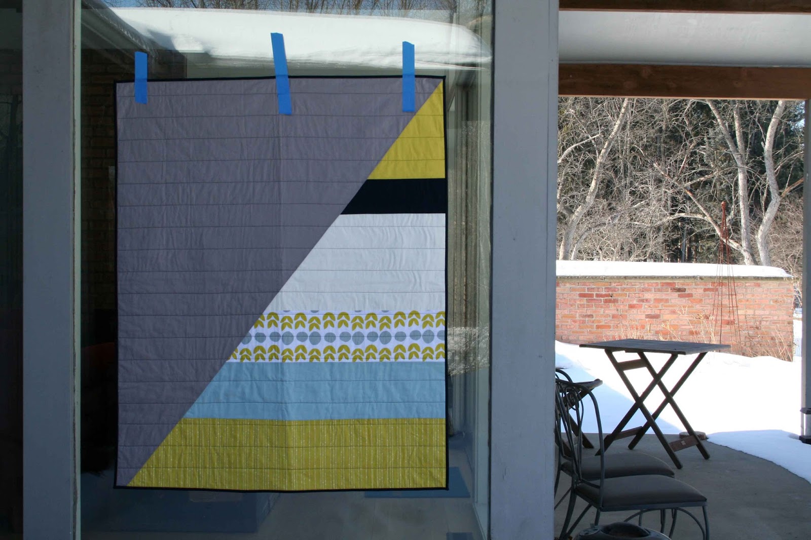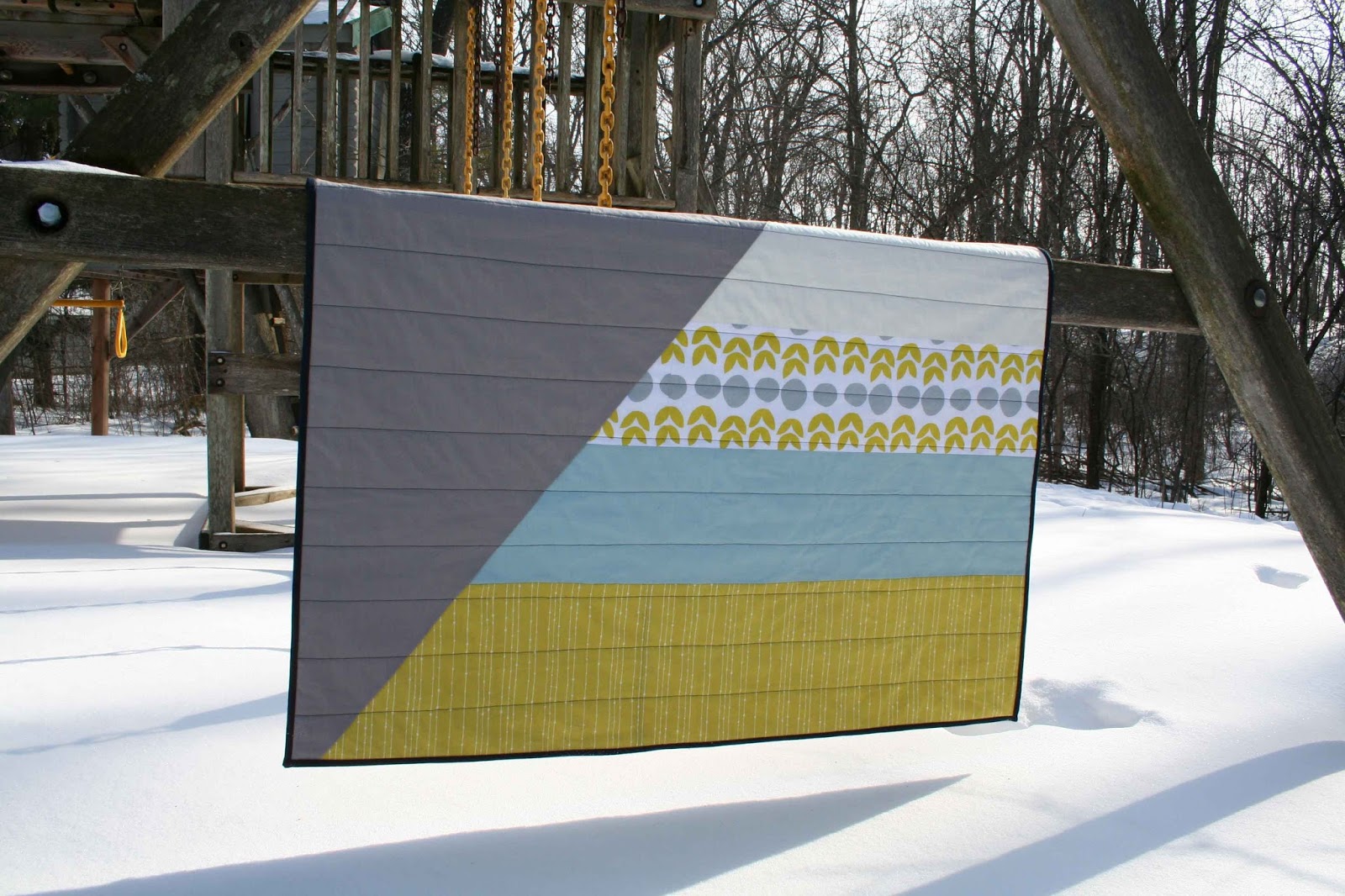 For some reason I’m on a finish-it kick. Here’s the latest, a baby sized quilt that is gender-neutral. The top has been sitting in my studio for months and months after Kelsey and I decided to imitate a similar quilt from Hopewell Workshop with the stripes and diagonal. We made up a quilt in stripes and then cut it on the diagonal and each took half. First dilemma, somehow my half didn’t quite work with the gray I had – it didn’t balance, so I changed up the stripes to add the citron you see. Then, I had a lovely gold Lotta fabric for the back, but it didn’t quite match the front so I couldn’t make myself finish it. Finally my mom was over and bought some of this lovely plus Cotton and Steel fabric for herself and we realized it was a great match. One quick trip to Pink Castle (I love having them in Ann Arbor) and it was ready to go. Still can’t quite decide if I love it, but its done and heading for the washing machine to soften it up. Yeah!